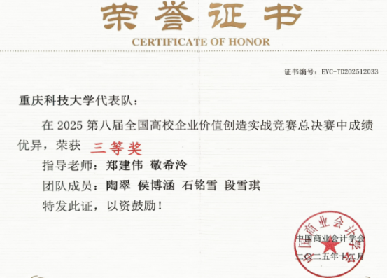 近日,2025年第八届全国高校企业价值创造实战竞赛全国总决赛在广东广州落下帷幕。经济与金融学院会计专业学生陶翠、石铭雪、侯博涵、段雪琪组成的团队在指导教师郑建伟、敬希泠的悉心指导下,积极学习企业价值创造理论,熟练掌握竞赛平台操作,深入研讨经营决策策略,取得全国总决赛三等奖的佳绩。